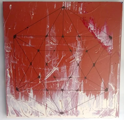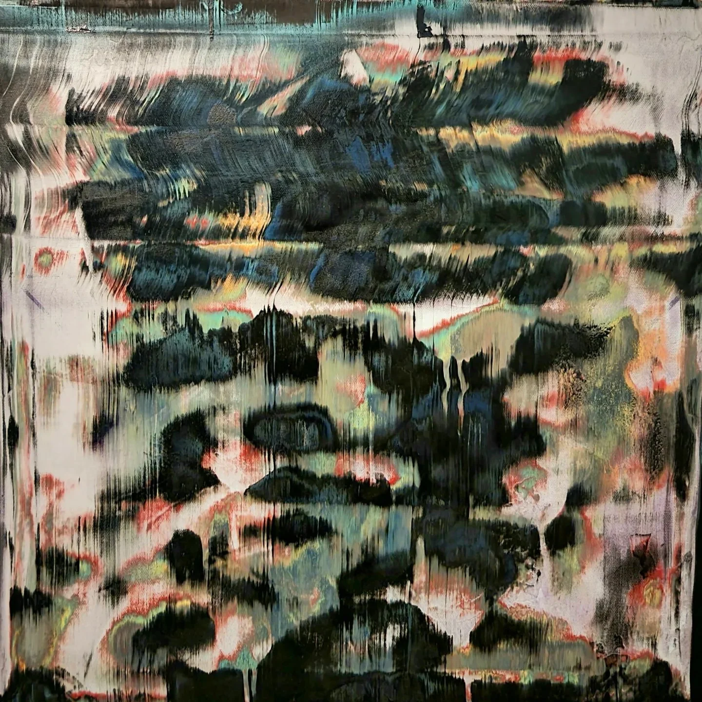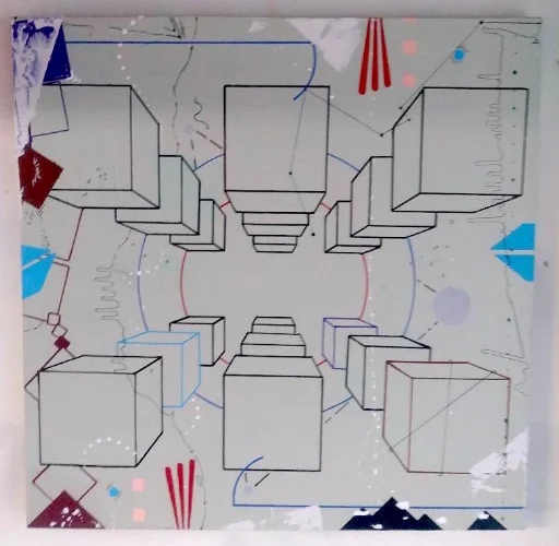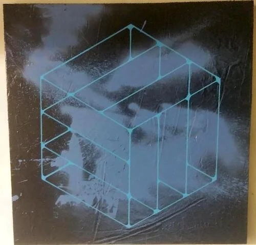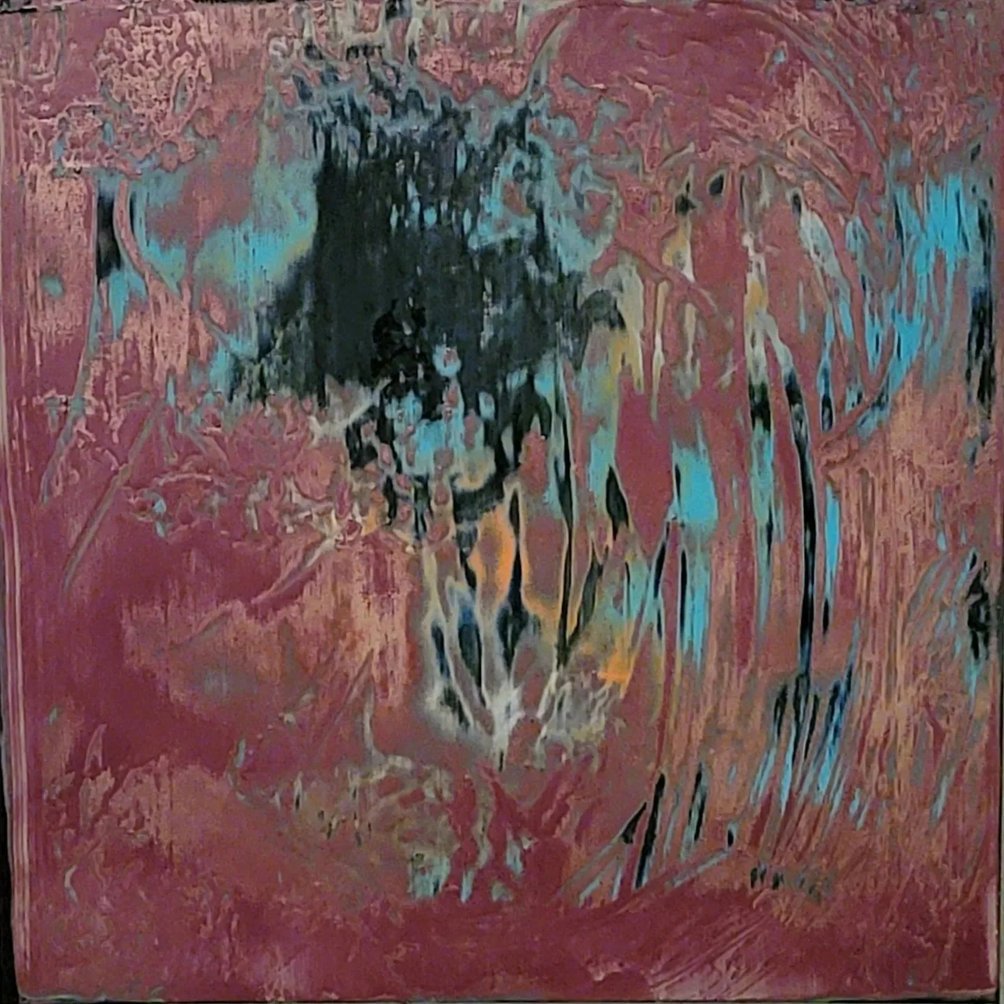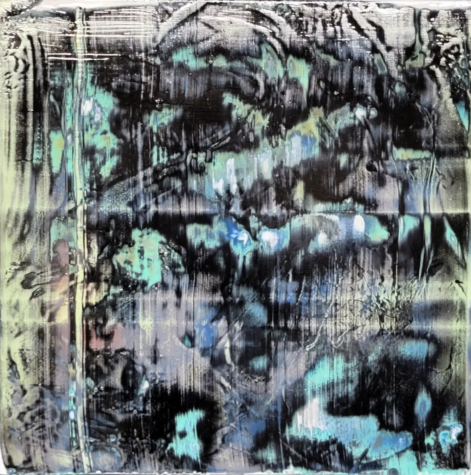 Acrylic, spray paint, spackle, recycled popcorn ceiling texture, house paint, spray concrete texture on canvas, 36 x 36”